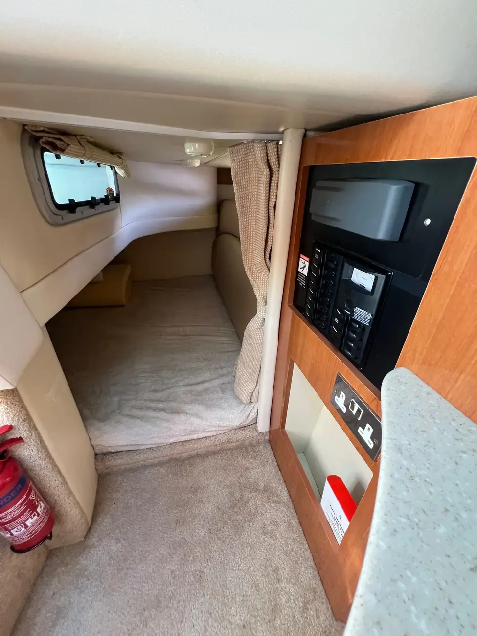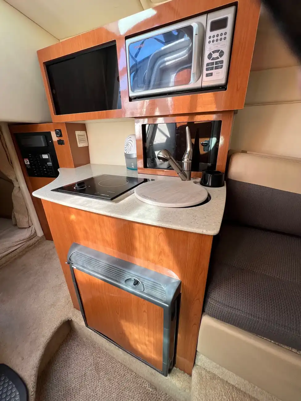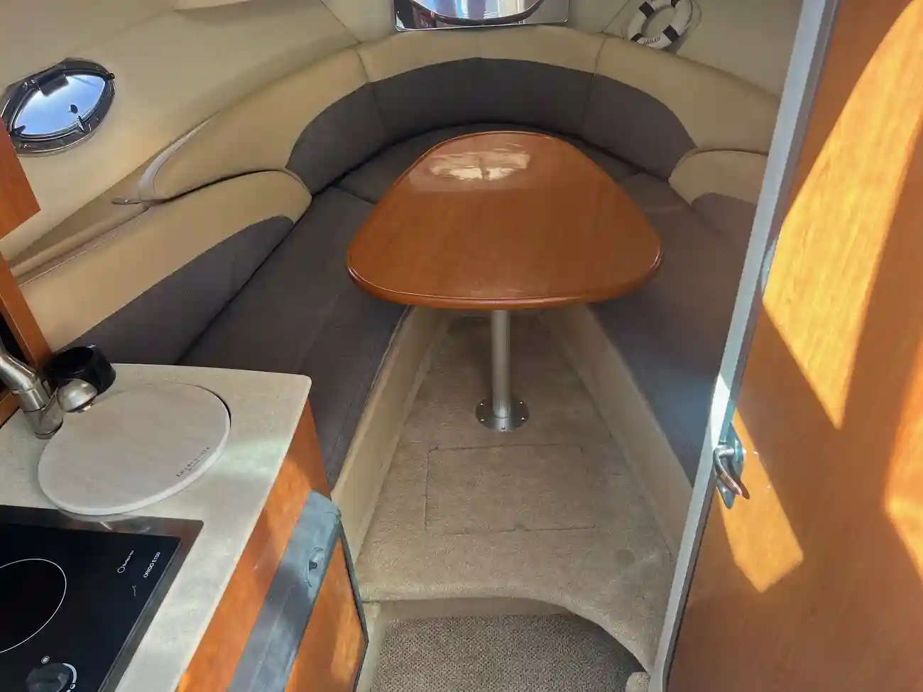 - Galley to port: The hinged work surface is a smart space-saver—makes food prep easy without cluttering the area.