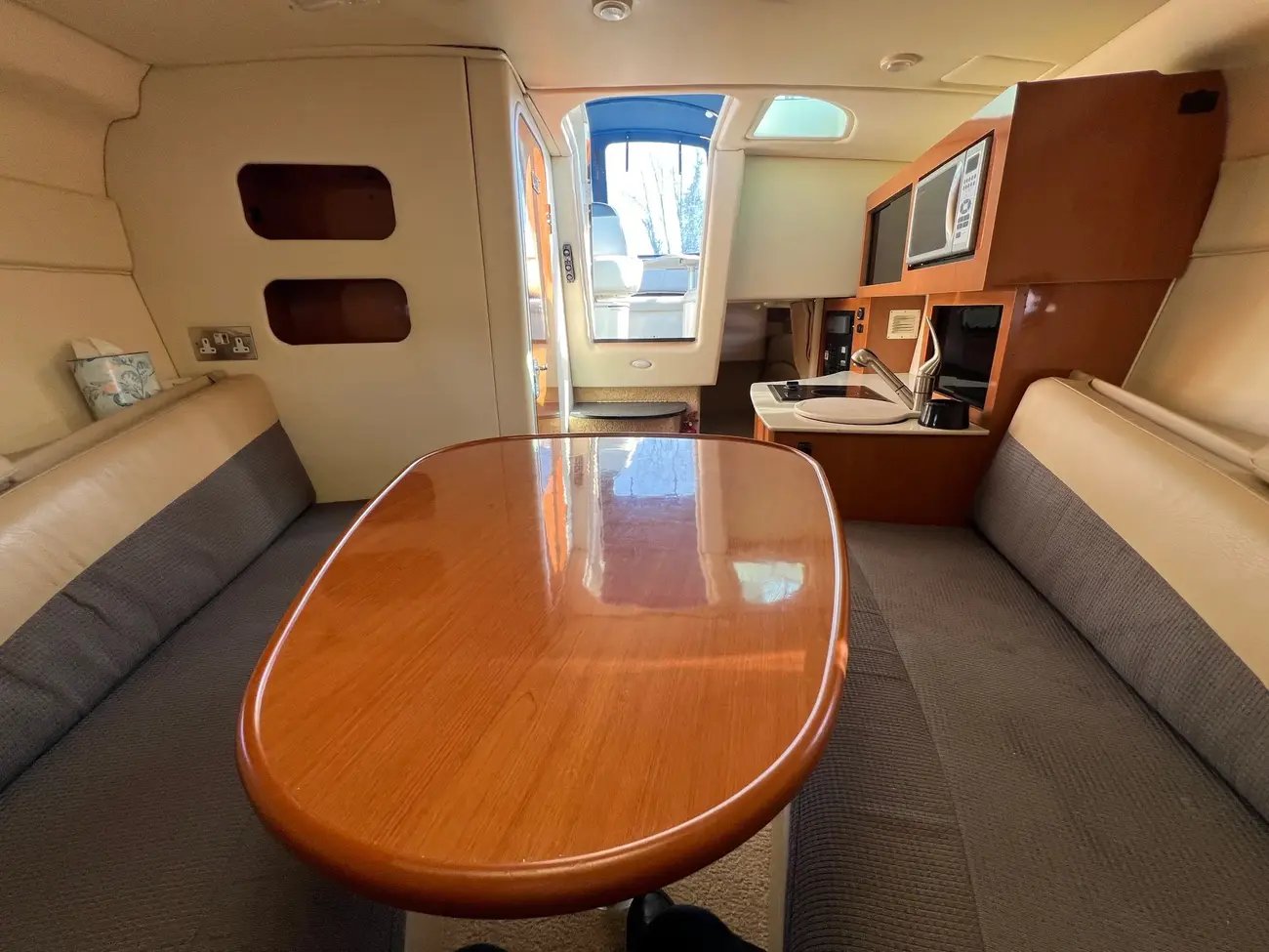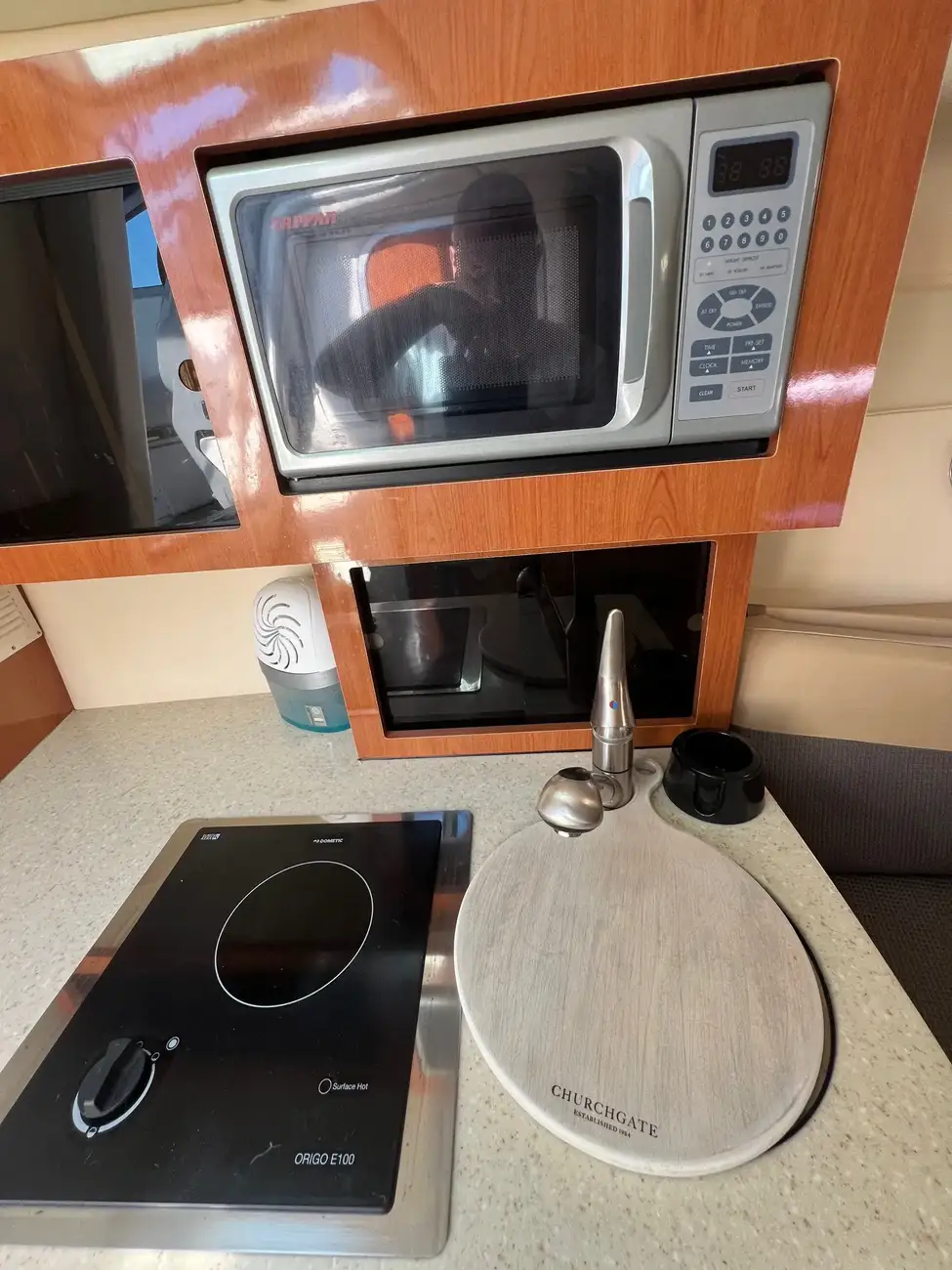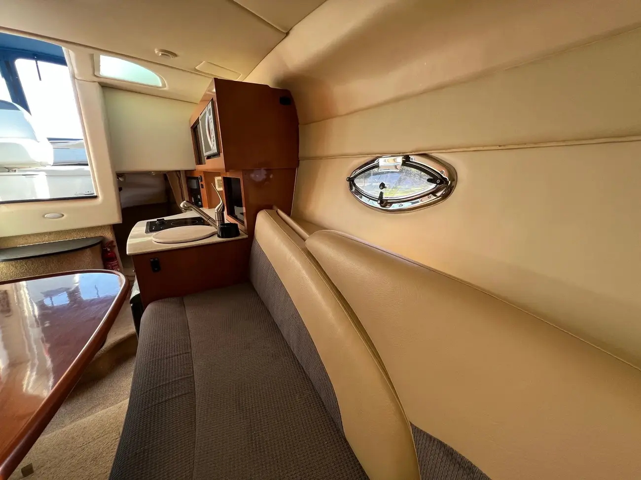 - Galley to port: The hinged work surface is a smart space-saver—makes food prep easy without cluttering the area.
