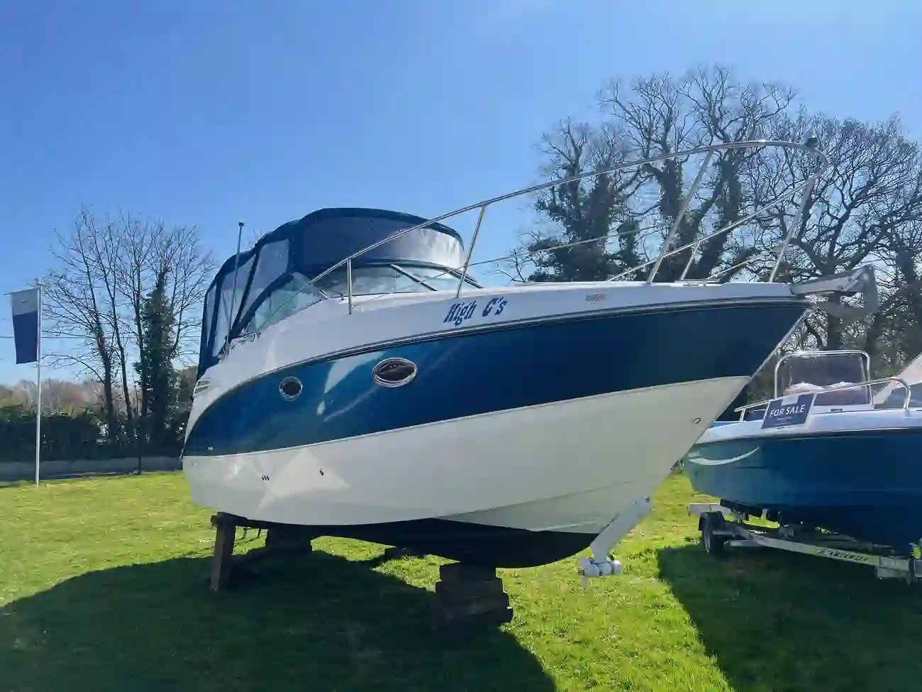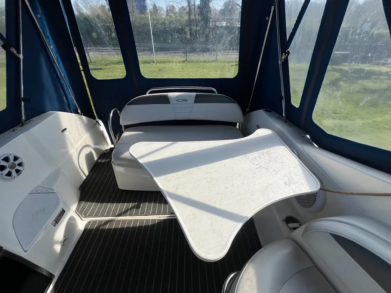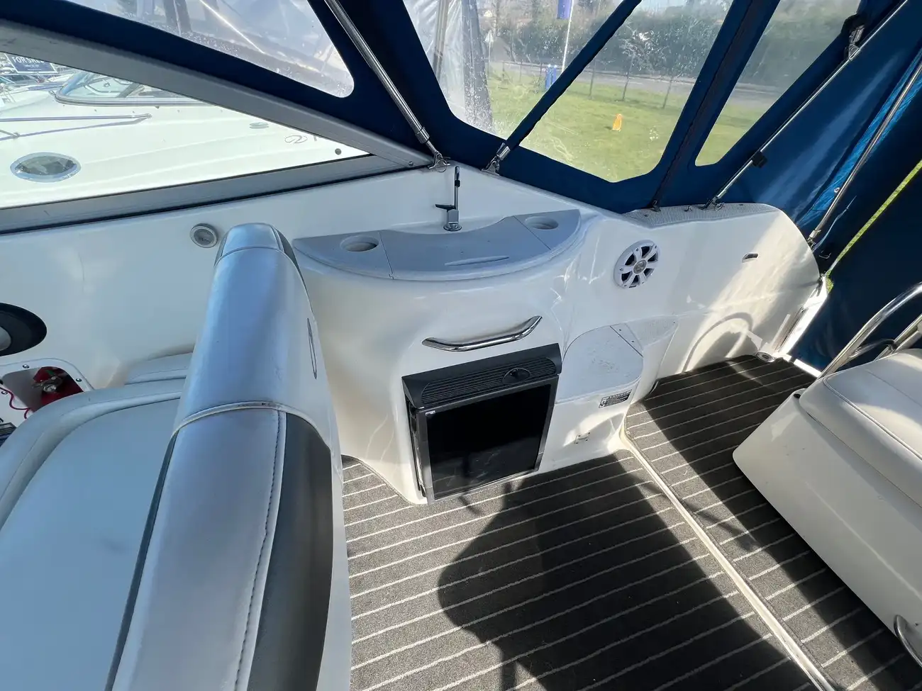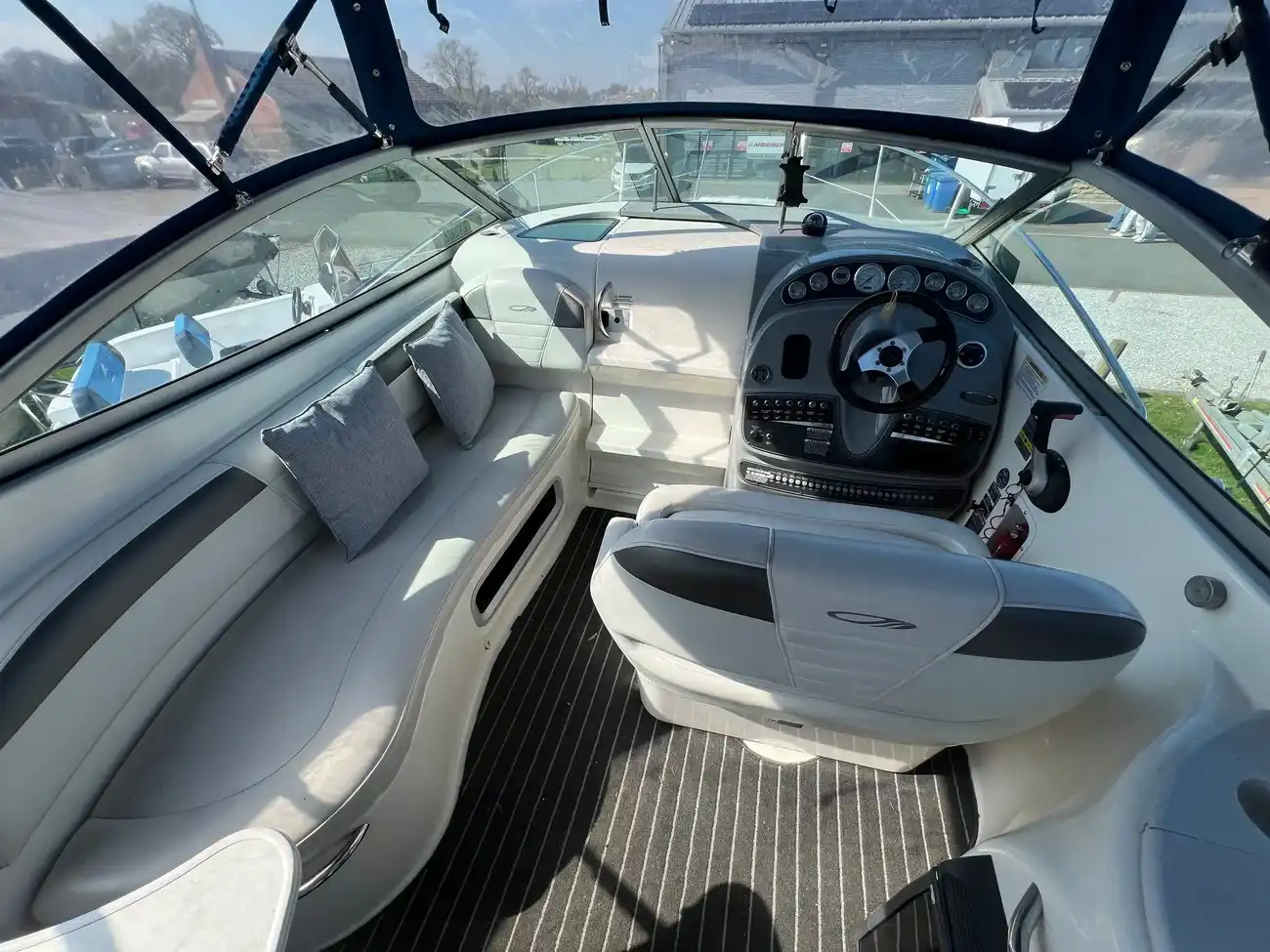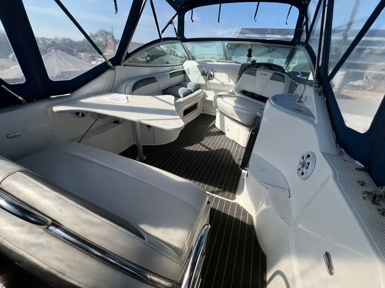 Mercruiser 350 MAG (300 HP) paired with a Bravo III outdrive gives you a good balance of power and efficiency—plenty for cruising in the mid-30s (mph), and quick onto plane. That setup is also known for relatively smooth handling and decent fuel economy, especially if well-maintained.